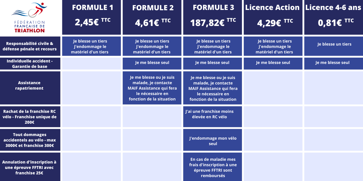 Avec trois niveaux de souscription possibles, allant de la garantie minimale obligatoire (formule 1) jusqu’à la garantie responsabilité civile et rapatriement, vélo (formule 3) qui renforce la couverture du pratiquant notamment pour ce qui concerne les frais d’annulation et les dommages au vélo. Il appartient à chacun de choisir la formule qui lui paraît la plus adaptée à ses propres besoins.